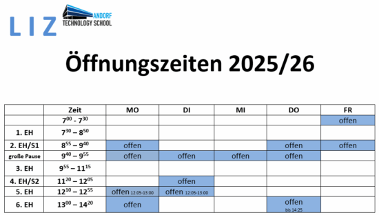 Lerninformationszentrum / LIZ Öffnungszeiten Ansprechpersonen: Mag.a Gabriele Kobleder Mag. Erhard Maier Online-Suche im Web-OPAC der HTBLA Andorf